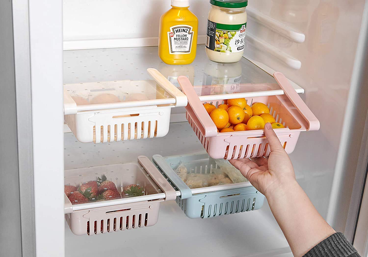Set of 4 Adjustable Refrigerator plastic Storage Basket, Expandable Fridge Rack, Sliding Vegetable Organizer Tray Freeze Space Saver Drawer